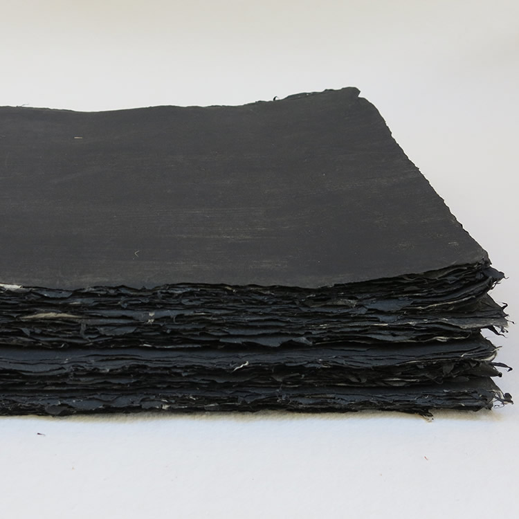 The paper is layered resho made from the bark of de-nar, a high growing variety of lokta from the Himalayan forests of Eastern Bhutan. This is a sustainable and renewable resource. The paper is coated with ground black earth, a colour used in traditional architecture of Bhutan. Vegan.