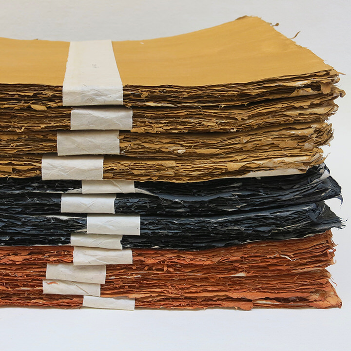 The paper is layered resho made from the bark of de-nar, a high growing variety of lokta from the Himalayan forests of Eastern Bhutan. This is a sustainable and renewable resource. The paper is coated with ground red earth, a colour used in traditional architecture of Bhutan. Vegan.