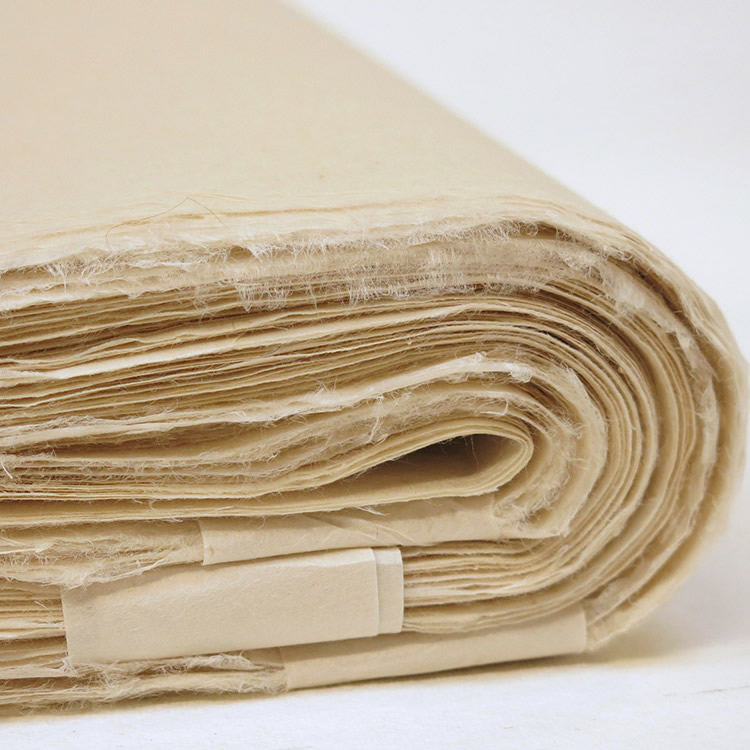 JDK is an artists’ handmade paper made from the inner bark or bast fibre of de-kar, not to be confused with de-nar (see Tsasho paper). De-kar has a lighter colour and has a superfine silk like quality. It is a native plant of the Himalayan foothills, sustainable and a renewable resource. Plants are cropped above ground level and can be reharvested after 3-4 years. The paper is made on a laid mould of split bamboo which gives a laid pattern to the sheet. The paper is couched and dried on a mud wall.