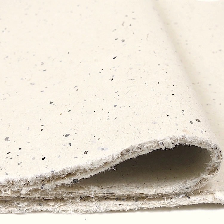 Artists’ handmade paper made from the inner bark or bast fibre of mitsumata with chopped tea leaf. Mitsumata is lighter toned and softer than lokta. Known as argeli in Nepal, this is a native plant of the Himalayan foothills. Mitsumata is a sustainable and renewable resource. Plants are cropped above ground level and can be reharvested after 3-4 years. The papers are made using the Japanese nagashizuki dipping and layering method of papermaking. Vegan.