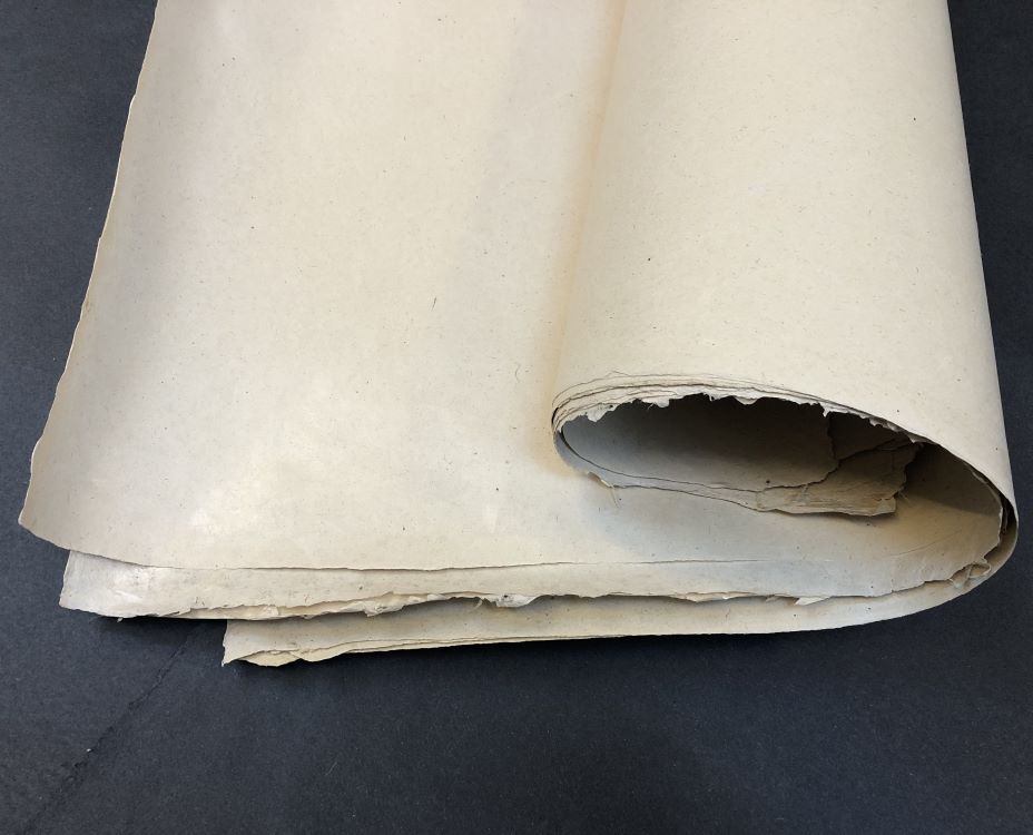 Traditional Islamic paper from North India made from raw sunn hemp fibre. Handmade on a chapri, a grass stem screen, the impression of the screen is visible on the sheet as a laid pattern. Sheets are dried on a plaster wall and surface sized with wheat starch. The paper is pressed between zinc sheets to make the smooth surface and burnished with agate stone. Vegan.