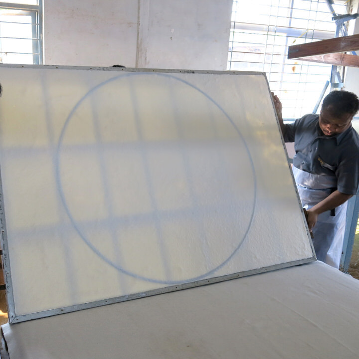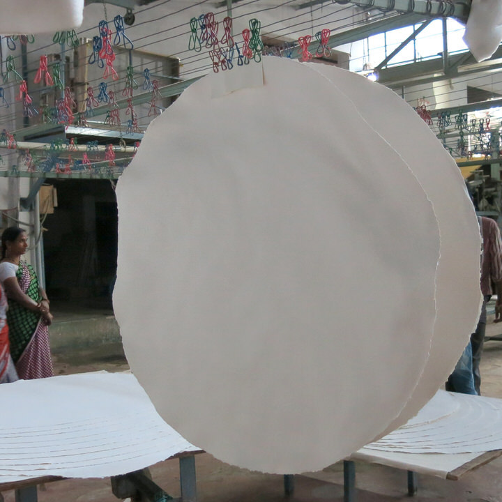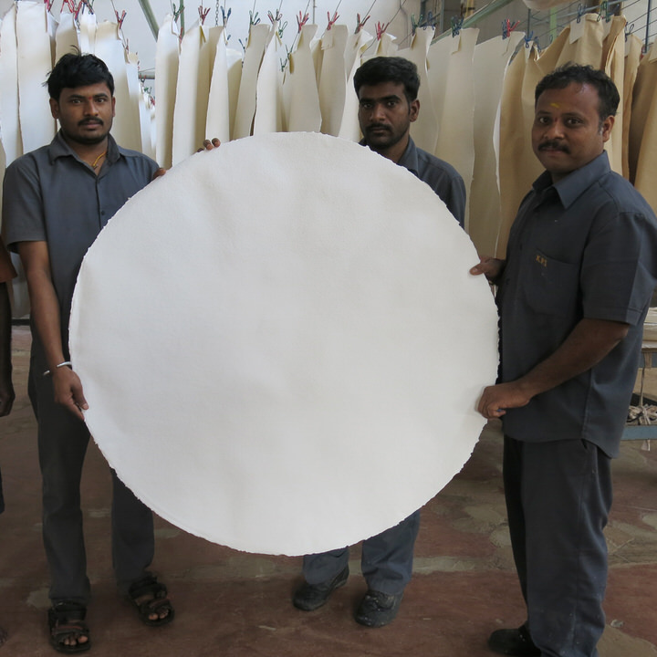 Artists’ handmade paper made from 100% long fibred cotton rag. One sheet of White Round is 110 cm in diameter and is one of the largest handmade rag papers made anywhere in the world.